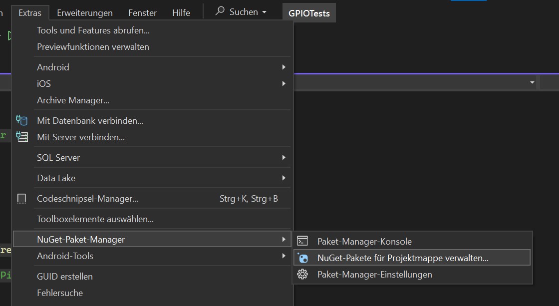 Damit die GPIO-Pins und die daran angeschlossene Hardware unter C# zur Verfügung steht, müssen dem Projekt zwei Pakete hinzugefügt werden: